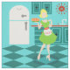 Mit diesem Retro-Küchengewebe können Sie auch Ihren Kuchen essen. Dieses kitschige, minimalistisch zeichnend Kunstwerk besticht durch seine perfekte Hausfrau aus den 50er Jahren, die sich in ihrer modernen Küche aus der Mitte des Jahrhunderts befindet. Der schöne Bäcker trägt ein flammendes, grünes Kleid und eine weiße Schürze mit roten Details. Kein Haar auf ihrem blonden Kopf ist fehl am Platz. Auf der einen Seite hält sie die Frucht ihrer Arbeit - ein wunderschöner, Gitterbetten, Obstkuchen. Ein Blick und Sie werden wissen, dass ihre fleckigen Kuchen Krusten sind zweitrangig. Sie ist auf einem Aqua-und aquamarinen Schachbrettboden stehend, der zweifellos sauber genug ist, um zu essen. An einer Wassermauer sehen wir aquamarine Kabinettsysteme mit Aqua-Trimm-Arbeiten, ein rotes Cover, rote Schublade und Akzente in schwarzer Sternexplosion. An der Wand hängt eine rote Sternexplosion. An der Seite befindet sich ein Staat der Kunst, weißer Kühlschrank mit silbernen Griffen. Zumindest war der Kühlschrank in den 1950er Jahren Staat der Kunst. Nun, es ist nur schlicht verträumt! Ob Sie nun Suzie Homemaker sind oder einfach nur eine Affinität zu allem Vintagen haben, Sie werden sicher sein, diese skrupellose Scheibe von Americana Liebe.