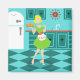 Mit diesem Retro Kitchen Magnet, können Sie Ihren Kuchen und essen Sie es auch. Dieses kitschige, minimalistisch zeichnend Kunstwerk besticht durch seine perfekte Hausfrau aus den 50er Jahren, die sich in ihrer modernen Küche aus der Mitte des Jahrhunderts befindet. Der schöne Bäcker trägt ein flammendes, grünes Kleid und eine weiße Schürze mit roten Details. Kein Haar auf ihrem blonden Kopf ist fehl am Platz. Auf der einen Seite hält sie die Frucht ihrer Arbeit - ein wunderschöner, Gitterbetten, Obstkuchen. Ein Blick und Sie werden wissen, dass ihre fleckigen Kuchen Krusten sind zweitrangig. Sie ist auf einem Aqua-und aquamarinen Schachbrettboden stehend, der zweifellos sauber genug ist, um zu essen. An einer Wassermauer sehen wir aquamarine Kabinettsysteme mit Aqua-Trimm-Arbeiten, ein rotes Cover, rote Schublade und Akzente in schwarzer Sternexplosion. An der Wand hängt eine rote Sternexplosion. An der Seite befindet sich ein Staat der Kunst, weißer Kühlschrank mit silbernen Griffen. Zumindest war der Kühlschrank in den 1950er Jahren Staat der Kunst. Nun, es ist nur schlicht verträumt! Ob Sie nun Suzie Homemaker sind oder einfach nur eine Affinität zu allem Vintagen haben, Sie werden sicher sein, diese skrupellose Scheibe von Americana Liebe.