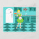 With this Retro Kitchen Postcard, you can have your pie and eat it, too. This kitschy, minimalist art drawing feature hat 1950's housewife in her century modern kitchen perfektioniert. The beautiful baker is wearing a flouncy, green dress and a white apron with red detailing. Not a hair on blonde head is out of place. In one hand, she is holding the fruit of her labor—a gorgeous, lattice topped, pie. One glance and you'know that her flaky pie crusts are second to none. She is standing on an aqua and teal checkerboard floor, which is undoubtedly clean enough to eat off of. Against an aqua wall, we see teal cabinetry with aqua trim work, a red countertop, red drawer pulls und black starburst accents. A red, starburst clock is hanging on the wall. To the side, there is a state of the art, white refrigerator with silver handles. At least, the fridge was state of the art in 1950's. Now, es ist nur plain dreamy! Whether you're Suzie Homemaker or simply have an affinity for all things vintage, you're sure to love this scrumptious slice of Americana.