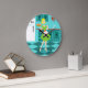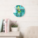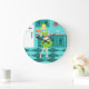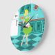 With this Retro Kitchen Round Acrylic Wall Clock, you can have your pie and eat it, too. This kitschy, minimalist art drawing features a perfect 1950's housewife, in her mid century modern kitchen. The beautiful baker is wearing a flouncy, green dress and a white apron with red detailing. Not a hair on her blonde head is out of place. In one hand, she is holding the fruit of her labor--a gorgeous, lattice topped, fruit pie. One glance and you'll know that her flaky pie crusts are second to none. She is standing on an aqua and teal checkerboard floor, which is undoubtedly clean enough to eat off of. Against an aqua wall, we see teal cabinetry with aqua trim work, a red countertop, red drawer pulls, and black starburst accents. A red, starburst clock is hanging on the wall. To the side, there is a state of the art, white refrigerator with silver handles. At least, the fridge was state of the art in 1950's. Now, it's just plain dreamy! Whether you're Suzie Homemaker or simply have an affinity for all things vintage, you're sure to love this scrumptious slice of Americana.