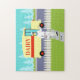 Wenn Sie einen Durst für einen modernen Entwurf der Mitte des Jahrhunderts haben, ist dieses Retro Kleinstadt-Milchmann-Puzzlespiel für Sie! Die Sechzigerjahre Art, unbedeutende KunstAusrüstungsbeschreibungen ein engagiertes, der Milchmann, der seinen Morgen macht, rundet. Der blonde Mann trägt milchige weiße Hosen, Shirt und Hut mit einer schwarzen Bogen-Krawatte, -gurt und -schuhen. Dieser Lieferbote von Kalzium und von Vitamin D geht herauf einen vorderen Bürgersteig und trägt die wöchentliche Versorgung einer Familie gesunde, frische Milch in den Glasflaschen. Die Morgenzeitung ist noch auf dem Bürgersteig. Sorgen Sie sich nicht. Nur gute Nachrichten werden in dieser Stadt erlaubt! Der Bürgersteig wird nach der Art des grünen Rasens nur gefunden in den Kleinstädten und in den Vororten umgeben. Es gibt auch ein Weiß, Palisadenzaun. In der Straße sehen wir die süße Fahrt des Milchmannes! Es ist ein sahniges Gelb, Milch-LKW mit einem roten Streifen auf der Seite und rote Beschriftung, die sagt, "MOLKEREI". Auf der gegenüberliegenden Seite der Straße sehen wir einen Aquahimmel und die hellblauen Silhouetten der Zedernbäume. Dieser kitschy Cartoon sieht wie eine Szene aus einem alten Fernsehsitcom heraus aus. Holen Sie auf den gelben Kuchen mit Schokoladen-Zuckergusse--der offizielle Kuchen aller Fernsehhausfrauen und ihrer glücklichen Familien! Starke Knochen des Gebäude schmeckten nie so gut!