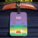 Moderne, farbenfrohe personalisierte Taschenmarke mit Retro-Stil Sonnenuntergang und Palmen Kunst.