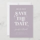Retro Save the Date Karte mit einem blockierten Schriftart, der "Save the Date" mit modernen Sternen aus der Mitte des Jahrhunderts sagt. Die Hintergrundfarbe ist lila oder lavender rosa. Sie können ein Foto auf der Rückseite hinzufügen.