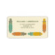 Diese Rücksendeadressen-Aufkleber sind mit Retrografien von Langboard-Skateboards in Orange, Senfgold, aquamarinem Blau, Salbei und Oliven-Set vor einem cremefarbenen Hintergrund versehen.
