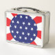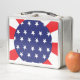 Whether you use it to bring your lunch or tote your lipstick , you'll love this retro style metal lunchbox with artwork by Buttercup's Clothing and Collectables! This super cute lunch box features an abstract pattern of stars and stripes in shades of red, white, and blue . Various background colors available.
