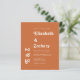 Diese moderne Retro-Hochzeitseinladung besticht durch cremefarbenen Text auf einem verbrannten orangen Hintergrund. Fügen Sie die Namen und Monogramm-Initialen der Braut und Bräutigam in stilvollem Retro-Display Typografie und die Details in sans Serif Schriftart. Auf der Rückseite ist ein passender Schatten massiv verbrannter Orange zu sehen.