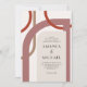 A modern spin on a glamorous art deco vibe or days gone by, this colorful wedding invitation has geometric curved shapes intertwined around the text layout of the invitation. Colors include neutral shades of terracotta, rust and tan with a neutral ivory beige shape framing your text. The results are unique and artistic with a retro appeal.