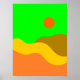 Dieses stilvolle Poster zeigt eine farbenfrohe und kühn gestaltete Darstellung einer Retro-Berglandschaft