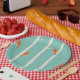 Teller mit einer Darstellung von Birkenbäumen mit Orangenvögeln auf ihren Zweigen. Retro grüner Hintergrund.