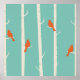 Ein Poster mit einer Darstellung von Birken mit Orangenvögeln, die auf ihren Zweigen sitzen. Retro grüner Hintergrund.