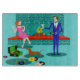 Dieses Retro-Paar mit Hundeband sieht aus wie eine Szene aus einer romantischen Komödie. Das minimalistische Design der 60er Jahre besticht durch ein ansprechendes Paar, das einen romantischen Abend bei der Zuhause genießt. Das elegante Zimmer besticht durch ein Aqua- und einen aquamarinen Backsteinkamin mit leuchtend rotem Kamin. Eine schöne, rötliche Frau, die ein helles, rosa Kleid trägt, steht auf der Spitze. Sie genießt einen Martini mit einem schwimmenden Oliven, einem rauschenden Feuer, guter Musik, und die Gesellschaft ein großer, dunkler und gut aussehender Mann. Der Mann trägt einen blauen Anzug und eine rote Krawatte. Sein Martini-Glas wird aufgezogen, um seinen bezaubernden Begleiter zu Toast. In seiner anderen Hand hält er ein Schallplattenalbum. An seinen Füßen sehen wir eine bezauberndste Dackel, die einen roten Kragen trägt. Der spielerische Dackel-Hund läuft in Richtung eines grünen Plattenspielers mit orangefarbenen Spindelbeinen. Auf dem Boden gibt es eine bunte Gruppe von lustigen, eklektischen, Vinyl-Platten. Prost! Hier ist der perfekte Abend bei Zuhause.