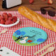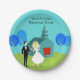 Dieser kundengerechte Retro Hochzeits-Paar-Papier-Teller hat Sie Anhörungshochzeitsglocken. Die Sechzigerjahre Art, unbedeutenden die KunstAusrüstungsbeschreibungen eine Braut und der Bräutigam an ihrem Hochzeitstag. Das glückliche Paar schaut gut genug, auf einem Hochzeitskuchen stehend zu sein. Aber sie sind nicht. Sie sind auf Stoff, grünes Gras stehend. Der debonaire Herr trägt einen klassischen, schwarzen Tuxedo mit schwarzer Bogen-Krawatte. Unten Damen! Er hat genommen! Er hält die Hand seiner schönen Frau, die in ihrem Teelänge, in weißen Kleid mit der passenden Taille der Form und in erweiterten Rock positiv leuchtend schaut. Sie sieht wirklich wie eine Prinzessin mit ihrem Tiara und gauzy, weißen Hochzeitsschleier aus, die auf ihrem hübschen blonden Kopf stillstehen. Neben ihnen führt ein Weg im Gras zu die reizend Kapelle der Welt. Die wunderliche, aquamarine und Türkiskirche ist die perfekte Einstellung für Sprichwort, "ich tun!" Ja ist hier die Kirche. Ist hier der Steeple. Wir können nur annehmen, dass, hinter jenen hellen roten, doppelten Türen ein Roomful Leute wartete gerade, um im Glück dieses Paares zu teilen ist. Die malerische Einstellung umfaßt auch vier, stilistisch, Cartoonbäume in den Schatten des Blaus. Es ist ein schöner Tag für eine Hochzeit, wie wir vom fehlerlosen Aquahimmel sehen können. Die einzige Sache, die von diesem modernen Entwurf der Mitte des Jahrhunderts vermisst ist, ist der Reis, und wir können annehmen, die bevorstehend sind. Personifizieren Sie mit Namen, Datum oder Gelegenheit.