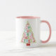 Diese spielerische Tasse zeigt das Sprichwort "Oh Weihnachtsbaum" mit abwechselnden Farben auf Kleinbuchstaben mit funkelnden Akzenten. Die Farben sind rosa, rot, grün und hellblau.