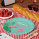 Diese individuellen Party-Teller sind mit einem Retro-Stil rosa Flamingo-Thema. Im unteren Teil befinden sich zwei Flamingos im Stil eines rosa Glitzer mit großen tropischen Palmen-Blätter auf den verlassen. Der Hintergrund ist wunderschön aquamarin, der Veranstaltungstitel und Ehrengast sind in einem Vintagen, weißen Schriftart gedruckt.