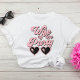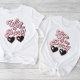 Ein niedlicher und sonniger Junggeselinnen-Abschied-T - Shirt für die Braut mit der "Ehefrau des Party" in einem großen Retro-Retro-Stil der 70er Jahre und einer herzförmigen Sonnenbrille. Ein koordinierender "Life of the Party'" T - Shirt steht für die Bachelorette-Mannschaft zur Verfügung.