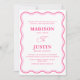 Die Retro Pink Wavy Formal Wedding Invitation, bei der spielerische Squiggle-Kurven in fett, kontrastfarben auf elegante Kalligraphie treffen, um eine visuelle Freude zu schaffen. Dieses moderne Schreibgerät strahlt einen weichen, lustigen und skurrilen Charme aus, der ideal für Paare ist, die sich vom traditionellen Stil abhalten möchten. Die trendige und wellige Einladung verspricht, eine unvergessliche Erklärung abzugeben und den Ton für eine einzigartige und unvergessliche Hochzeitsfeier zu setzen.
