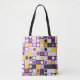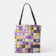 Dieses Bild ist ein lebendiges geometrisches Muster, bestehend aus Quadraten und Kreisen in einer spielerischen, sich wiederholenden Anordnung. Die Farbpalette besteht aus hellgelben, fett lila, weichen Lavendel, Holzkohle schwarz und knusprig weiß. Jedes Quadrat enthält entweder einen kontrastfarbenen Single oder ist mit einer festen Farbe gefüllt. Die skurrile Platzierung und rhythmische Wiederholung von Kreisen innerhalb des Gitters rufen ein retro-spielerisches Erscheinungsbild hervor, das an das moderne Design der Mitte des Jahrhunderts erinnert.