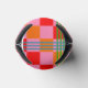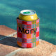 This can cooler has a mid-century modern design of red, pink, and orange squares and green and blue lines forming a plaid design.