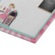 Une planche à découper mignonne avec un rétro thème de magasin de soude avec la fille dans la jupe de caniche, le juke-box et le menu embarquent avec la frontière rose de rayon du soleil et les notes musicales.
