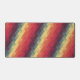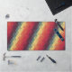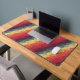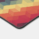 Diese Schreibtischmatte ist ein dynamisches geometrisches Muster mit wiederholenden Würfeln und Parallelogrammen, die in diagonalen Streifen angeordnet sind. Die Farbpalette ist reich an warmen Farbtönen - Rot, Orangen, Gelb - vermischt mit gedämpften Grüntönen und Blues, wodurch ein visuell dynamischer, fast 3D-Effekt entsteht. Die Formen scheinen sich zu verflechten und bilden eine durchgehende, tessellierte Landschaft, die sowohl Retro- als auch moderne Ästhetik hervorruft.