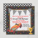 Commencez vos moteurs avec cette invitation colorée de voiture de course rétro ancienne. à damiers drapeau et le trophée de numéro changeable avec des serpentins et des confettis. Idéal pour un concours de derby Soapbox. Illustration tirée à la main de McBooboo.