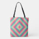 Dieses Bild weist ein gewagtes geometrisches Muster auf, das aus konzentrischen Diamanten besteht, die jeweils aus farbenfrohen diagonalen Streifen gebildet werden, die von der Mitte ausstrahlen. Die Primärfarben sind aquamarin, korallenrosa und hellbeige, die sich in dicken, sogar Bändern auswechseln, um einen rhythmischen, kaleidoskopischen Effekt zu erzeugen. Der Gesamteindruck ist lebendig, retro und visuell dynamisch und zeichne das Auge des Betrachters in Richtung Zentrum.