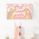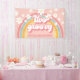 Zwei Groovy! Retro inspirierte Banner zum 2. Geburtstag mit Schriftart und Farben im Stil der 70er Jahre, Regenbogen und Gänsebläschen in Rosa