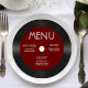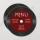 Dunkelroter Bordeaux, Retro Vinyl Record Hochzeitsempfang Menü. Lassen Sie es sich individuell zubereiten, indem Sie Ihre Mahlzeiten hinzufügen. Ideal für ein altes Hochzeitslook und Gefühl.