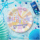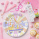 Ein lustiges pastellfarbenes Design mit einem weißen Roller-Skate mit dem Text 'Let's Roll' auf einem Regenbogen Berst Hintergrund mit Gänsen. Das Design ist in Rosa, Orange, Gelb und lila gehalten. Sehen Sie sich die komplette passende Party-Auflistung an.