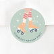 Niedlicher Skaten-Geburtstagsparty-Aufkleber mit Retro-inspiriert Abbildung von orangefarbenen Roller-Skaten auf einem Mädchen mit rot gestreiften Socken. Fügen Sie ihren Namen dunkelblaue Typografie hinzu.