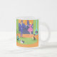 Diese Retro romantische Abends-Paar-mattierte GlasTasse sieht wie eine Szene aus einer Sechzigerjahre romantischen Komödie heraus aus. Die unbedeutenden Ausrüstungsbeschreibungen ein attraktives Cartoonpaar im Wohnzimmer einer Mitte des Jahrhunderts modern, städtische Wohnung. Der Raum kennzeichnet vorstehend ein Grün, Steinwand mit einem Boden zum Deckenfenster mit einer Ansicht. Durch das Fenster können wir die blaue Silhouette eines großen Stadt Skyline sehen. Ein sichelförmiger Mond ist im orange Himmel des Sonnenuntergangs gerade sichtbar. Die Einrichtungsgegenstände im Raum schließen ein Grün, Klubsessel mit zusammenpassendem Schemel, ein Gelb, Sputnik-Leuchte und einen Türkis, den kegelförmigen Kamin mit ein, der mit Brüllenfeuer komplett ist. In der Mitte des orange Bodenbelags, gibt es eine runde, grüne Noppewolldecke. Ein Portable, ein Türkis und ein schwarzer Rekordspieler wird auf die Wolldecke gesetzt. Nahe bei dem Rekordspieler kann eine Vinylaufzeichnung gesehenes Stoßen aus einer kitschy Albumabdeckung heraus sein. Auch auf der Wolldecke, gibt es eine glatte, schwarze Katze, die einen aquamarinen Kragen trägt. Dieses extravagante katzenartige sitzt vor einem Martini-Glas. Diese Szene genießend, haben wir ein sehr hoch entwickeltes Paar. Es gibt einen höflichen Mann, der einen blauen Anzug, ein hellblaues Shirt und eine rote Krawatte trägt. Das hohe, die Dunkelheit und der gutaussehende Mann genießt die Firma einer eleganten blonden Frau. Die reizende Dame trägt ein Pinkkleid mit einem passenden Mieder der Form und einem erweiterten Rock. Sie sind jede Holding ein Kristallmartini-Glas mit einer sich hin- und herbewegenden Olive. Beifall! Ist hier zum perfekten Abend zu Hause!