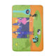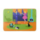 Diese Retro Romantic Abend Couple Bath Mat sieht aus wie eine Szene aus einer romantischen Comedy aus den 1960er Jahren. Das minimalistische Design bietet ein attraktives Cartoon-Paar im Wohnzimmer eines modernen, urbanen Apartments aus der Mitte des Jahrhunderts. Der Raum ist mit einer grünen Steinwand versehen, die von einer Decke bis zum Boden reicht und einen Ausblick bietet. Durch das Fenster können wir die blaue Silhouette einer großen City-Skyline sehen. Ein Halbmond ist nur im orangen Himmel des Sonnenuntergangs zu sehen. Die Einrichtung des Zimmers umfasst einen grünen Sitzstuhl mit passendem Fußhocker, eine gelbe, sputnikfarbene Leuchte sowie einen türkisfarbenen, konischen Kamin, der mit einem Brand versehen ist. In der Mitte des orangefarbenen Bodens befindet sich ein runder, grüner Teppich. Auf dem Teppich befindet sich ein tragbarer, türkisfarbener und schwarzer Plattenspieler. Neben dem Plattenspieler kann man eine Schallplatte aus einem kitschigen Albumcover sehen. Auch auf dem Teppich befindet sich eine schwarze, schlanke Katze, die einen aquamarinen Kragen trägt. Diese extravagante Katze sitzt vor einem Martini-Glas. In dieser Szene haben wir ein sehr raffiniertes Paar. Es gibt einen suave Mann mit einem blauen Anzug, hellblauem Shirt und roter Krawatte. Der große, dunkle und gut aussehende Mann genießt die Begleitung einer eleganten Blondine. Die hübsche Dame trägt ein heißes rosa Kleid mit einem formschönen Bodice und einem geschmackvollen Rock. Sie besitzen jeweils ein Kristallmartini-Glas mit schwimmendem Olivenöl. Prost! Hier zum perfekten Abend bei Zuhause!