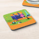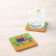 Diese Retro Romantic Abend Couple Hard Plastic Untersetzer sehen aus wie eine Szene aus einer romantischen Comedy aus den 1960er Jahren. Das minimalistische Design bietet ein attraktives Cartoon-Paar im Wohnzimmer eines modernen, urbanen Apartments aus der Mitte des Jahrhunderts. Der Raum ist mit einer grünen Steinwand versehen, die von einer Decke bis zum Boden reicht und einen Ausblick bietet. Durch das Fenster können wir die blaue Silhouette einer großen City-Skyline sehen. Ein Halbmond ist nur im orangen Himmel des Sonnenuntergangs zu sehen. Die Einrichtung des Zimmers umfasst einen grünen Sitzstuhl mit passendem Fußhocker, eine gelbe, sputnikfarbene Leuchte sowie einen türkisfarbenen, konischen Kamin, der mit einem Brand versehen ist. In der Mitte des orangefarbenen Bodens befindet sich ein runder, grüner Teppich. Auf dem Teppich befindet sich ein tragbarer, türkisfarbener und schwarzer Plattenspieler. Neben dem Plattenspieler kann man eine Schallplatte aus einem kitschigen Albumcover sehen. Auch auf dem Teppich befindet sich eine schwarze, schlanke Katze, die einen aquamarinen Kragen trägt. Diese extravagante Katze sitzt vor einem Martini-Glas. In dieser Szene haben wir ein sehr raffiniertes Paar. Es gibt einen suave Mann mit einem blauen Anzug, hellblauem Shirt und roter Krawatte. Der große, dunkle und gut aussehende Mann genießt die Begleitung einer eleganten Blondine. Die hübsche Dame trägt ein heißes rosa Kleid mit einem formschönen Bodice und einem geschmackvollen Rock. Sie besitzen jeweils ein Kristallmartini-Glas mit schwimmendem Olivenöl. Prost! Hier zum perfekten Abend bei Zuhause!