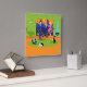 Diese Retro Romantic Abend Couple Acrylic Wall Clock sieht aus wie eine Szene aus einer romantischen Comedy aus den 1960er Jahren. Das minimalistische Design bietet ein attraktives Cartoon-Paar im Wohnzimmer eines modernen, urbanen Apartments aus der Mitte des Jahrhunderts. Der Raum ist mit einer grünen Steinwand versehen, die von einer Decke bis zum Boden reicht und einen Ausblick bietet. Durch das Fenster können wir die blaue Silhouette einer großen City-Skyline sehen. Ein Halbmond ist nur im orangen Himmel des Sonnenuntergangs zu sehen. Die Einrichtung des Zimmers umfasst einen grünen Sitzstuhl mit passendem Fußhocker, eine gelbe, sputnikfarbene Leuchte sowie einen türkisfarbenen, konischen Kamin, der mit einem Brand versehen ist. In der Mitte des orangefarbenen Bodens befindet sich ein runder, grüner Teppich. Auf dem Teppich befindet sich ein tragbarer, türkisfarbener und schwarzer Plattenspieler. Neben dem Plattenspieler kann man eine Schallplatte aus einem kitschigen Albumcover sehen. Auch auf dem Teppich befindet sich eine schwarze, schlanke Katze, die einen aquamarinen Kragen trägt. Diese extravagante Katze sitzt vor einem Martini-Glas. In dieser Szene haben wir ein sehr raffiniertes Paar. Es gibt einen suave Mann mit einem blauen Anzug, hellblauem Shirt und roter Krawatte. Der große, dunkle und gut aussehende Mann genießt die Begleitung einer eleganten Blondine. Die hübsche Dame trägt ein heißes rosa Kleid mit einem formschönen Bodice und einem geschmackvollen Rock. Sie besitzen jeweils ein Kristallmartini-Glas mit schwimmendem Olivenöl. Prost! Hier zum perfekten Abend bei Zuhause!