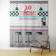 Einzigartig und Spaß! Retro Diner Countertop Hintergrund mit rosa und blauen Farben und Schachbrettmuster. Passen Sie den Namen, das Alter oder die Initialisierung des Menübanners an. ©2021 Miss Sassy Party Designs