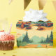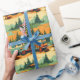 Geburtstagsgeschenkpackung in Vintagen Farben grün, braun und orange Camping Geschenkpackung mit RV-Campern und Kiefern.