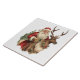 Keramik Kachel mit einer lustigen Weihnachtsillustrierung. Der Weihnachtsmann in seinem traditionellen roten Anzug reitet auf einem großen, mit Heiligen dekorierten Rentier. Ein Weihnachtsbaum hinten.