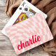 Spielkarten mit einem hellrot-rosa, verdrillten Schachbrettmuster und Ihrem Namen in einem roten Retro-Schriftart.