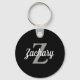 This personalized keychain features a light gray monogram initial and white retro script name on a black background. A simple yet distinctive design for a man or woman.