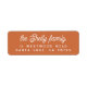 Ein Retro-Script-Rückgabeadresse-Label. Dieses Label mit Familienname in einem spielerischen Retro-Skript, dessen Adresse in knalligen, weißen Hauptstädte gedruckt wird, hebt sich von einem fett-hellen, orangefarbenen Hintergrund ab. Diese Labels sind ideal für alle, die ein stilvolles, auffälliges Design Liebe haben. Sie eignen sich hervorragend für den täglichen Gebrauch oder für die Urlaubspost. Sehen Sie sich die auf dieser Seite verlinkte Sammlung für passende Artikel an oder besuchen Sie unseren Shop für weitere Rücksendeadressen-Aufkleber!