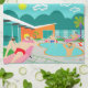 Caractéristiques de conception ce rétros de réception au bord de la piscine de cuisine gaies de serviette quatre beaux mâles hunky ayant un ancien gai comme elles ont battu la chaleur de Palm Springs par lounging autour l'eau bleue de turquoise de leur piscine formée par boomerang atomique. L'architecture moderne de la moitié du siècle sur la maison en pierre fabuleuse et orange est clairement les immobiliers principaux, donnés l'avis des montagnes à l'arrière-plan. Un soleil jaune de starburst brille brillamment dans le ciel de turquoise ainsi vous pouvez voir chaque détail avec du charme--des flamants kitschy et roses aux années 1950 barrées, barrière fraîche de blocs. Et naturellement quelle Chambre de Palm Springs serait complète sans palmier ?
