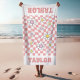 Multi Custom Color and Font Style - serviette de plage personnalisée avec nom, super, marguerites et rétro à damiers arrière - plan. Customisez toutes les couleurs comme vous le souhaitez ! Idée cool pour le cadeau Bridesmaid !