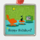 It is said that dogs have owners and cats have staff. The feline on this Customizable Retro Space Age Kitty Christmas Ornament couldn't agree more! The 1960's style, minimalist art design feature a sleek, black cat in a mid century modern living room. The sophisticated room prominently feature a green, stone wall. The carpet is aqua with teal shadows. The furnishings of the room include a yellow, sputnik light figur, an orange lounge fleisch with matching footstool and a green television with rabbit ears. The lucky black cat can be seen perched on the footstool in front of the television. Die Lieblingsshow! Wir haben es mit der Television screen zu tun, we can see a black and white, classic television family solving all of life Problems in a half hour show. Personalize this for a one of a kind gift. This design is purrrfect, if we do say so ourselves.