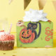 Handgemalte, schwarze Kätzchen, Jack-o-Laternen, Monde und Sterne mit Spooky Handschrift auf einem kalkgrünen Hintergrund, schwarz, orange, lila.