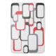 Ein lustiges, Vintages inspiriertes Muster-Design, bestehend aus Retro-Quadraten in Rot, Schwarz und Grau vor weißem Hintergrund