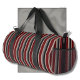 Retro stripes on this classic, dark design. Vertical red, blue, and beige stripes adorn the entire duffel bag, including the sides. There's a vertical area on one side for your name or text.