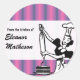Une illustration vintage d'un boulanger contre un arrière - plan rayé violet forme la base visuelle de ce mignon autocollant. Utilisez l'expression "De la cuisine de" ou faites-la vous-même et ajoutez votre nom (ou celui d'une autre personne). Inscrivez ci-dessous votre nom de plat. Disponible dans d'autres modèles et combinaisons de couleurs.