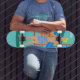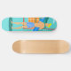Mit diesem Retro Surfer Typ Skateboard kann jeder Tag am Strand sein. Das minimalistische Design der 1960er Jahre besticht durch einen sonnengeküssten, blonden, surfer Typ, der alle bereit ist, eine Welle zu fangen. Unser passender Surfer blickt durch die Glasschiebetüren seiner Strandpromenade-Zuhause auf das Meer hinaus. Er ist in seinem aquafarbenen Wohnzimmer stehend. Wir können ein Aqua und Türkis sehen, Steinmauer und Mitte des Jahrhunderts modernen, orangefarbenen Stuhl. Auf der gegenüberliegenden Seite der Glastür sieht man einen Innenhof. Darüber hinaus gibt es einen goldenen Sandstrand, eine schwebende Palme, einen glitzernden, pfauenblauen Ozean und einen Wasserhimmel. In der Ferne sehen wir eine aquamarine Vulkaninsel, die vorerst ruhend ist. Surfer Typ hält ein blaues Surfbrett und trägt blaue, tiki gemusterte Brettshorts. Fang ein paar Wellen und teile Liebe mit diesem kitschigen Sommerdesign!