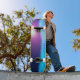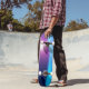 Retro synthwave glühende Neonlichtlandschaft 1980 Skateboard