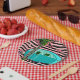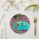 Rosa und Schwarzes striped Hintergrund mit Palme und Türkis Teardropcamper